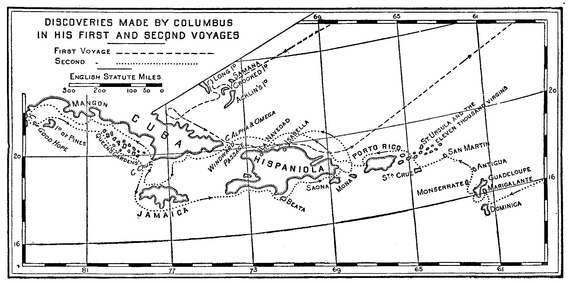 Footnote 585: While the Spaniards were on this island they encountered a party of tall and powerful women armed with bows and arrows; so that Columbus supposed it must be the Asiatic island of Amazons mentioned by Marco Polo. See Yule's Marco Polo, vol. ii. pp. 338-340.[Back to Main Text]