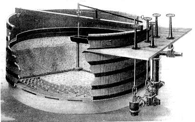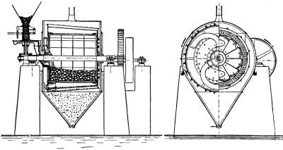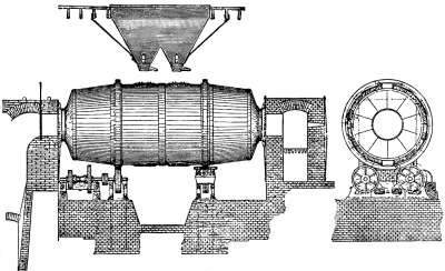Das Verfahren, durch das diese Gewinnung ermöglicht wird, ist das denkbar einfachste. Das Erz wird – wenn es nicht schon ohnehin sandförmig ist – zunächst gemahlen und zwar in sogenannten Kugelmühlen – kurze, sich drehende Trommeln mit Stahlkugelfüllung, [8] worin die Kugeln durch die drehende Bewegung geschüttelt werden und dadurch eine mahlende Wirkung ausüben – oder in sogenannten Rohrmühlen, in denen die mahlenden Kugeln in einem langen Stahlrohre untergebracht sind. Manche Erze müssen vor dem Zermahlen mit Hilfe von Röstöfen unter Luftzutritt erhitzt, „geröstet“ werden (Abb. 1, 2, 3).