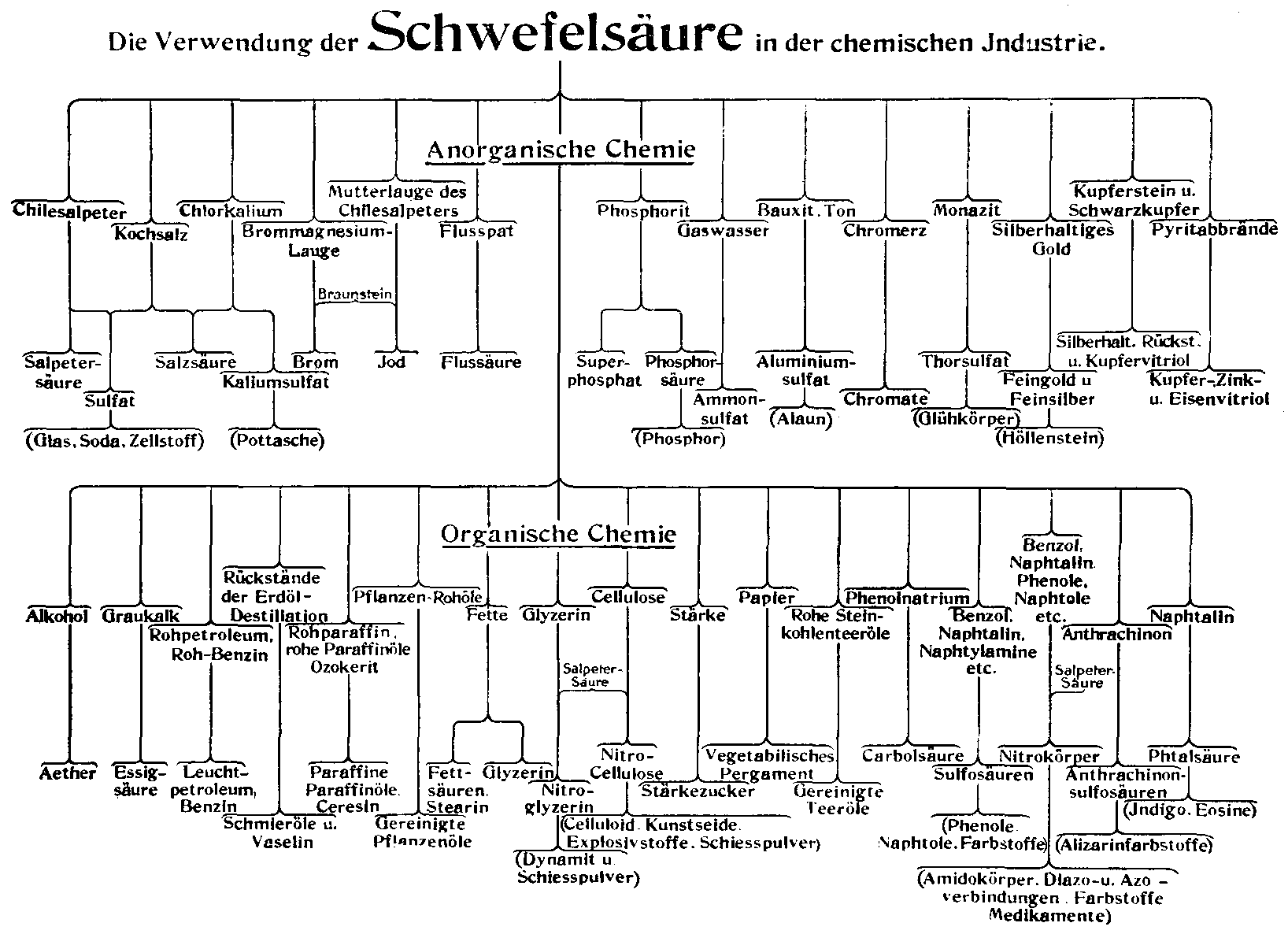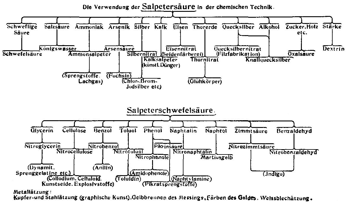 [1] Über die vielseitige Verwendung der Salpetersäure und der Salpeterschwefelsäure in der Sprengstoffabrikation wie in der chemischen Technik überhaupt gibt die beifolgende Tabelle aus dem „Deutschen Museum“ Aufschluß: