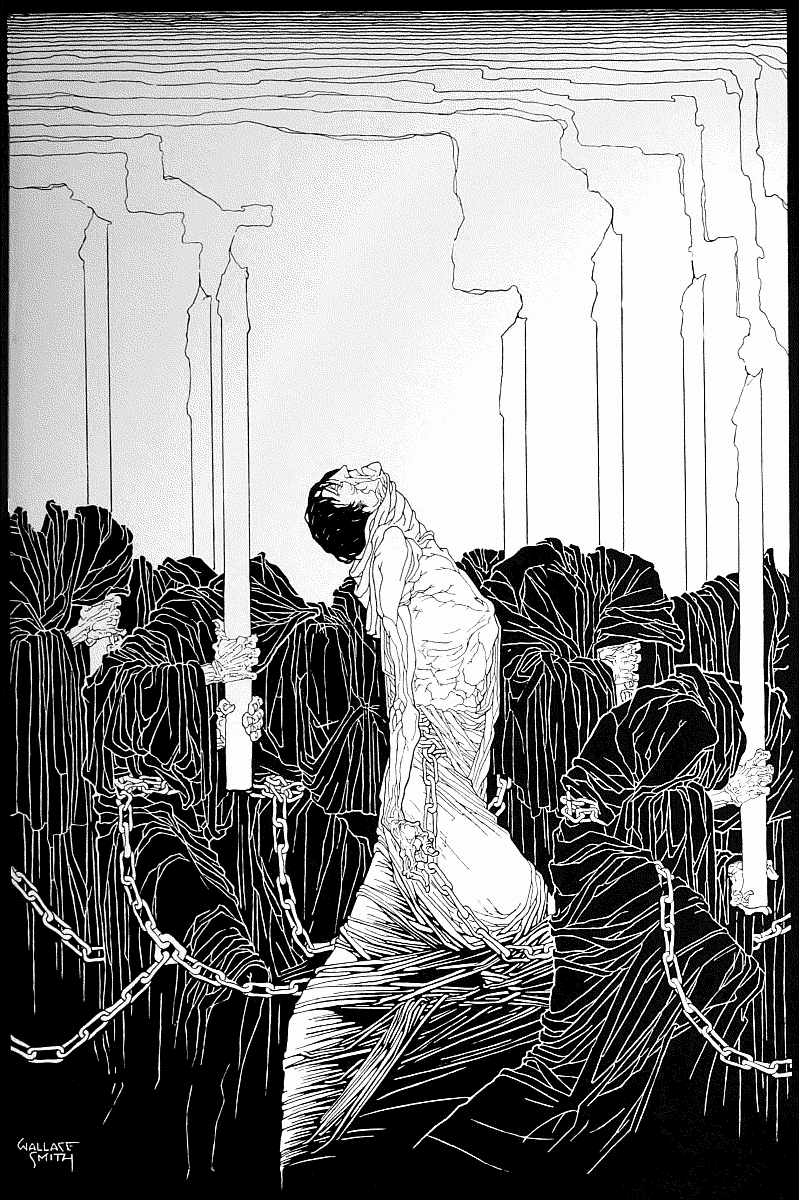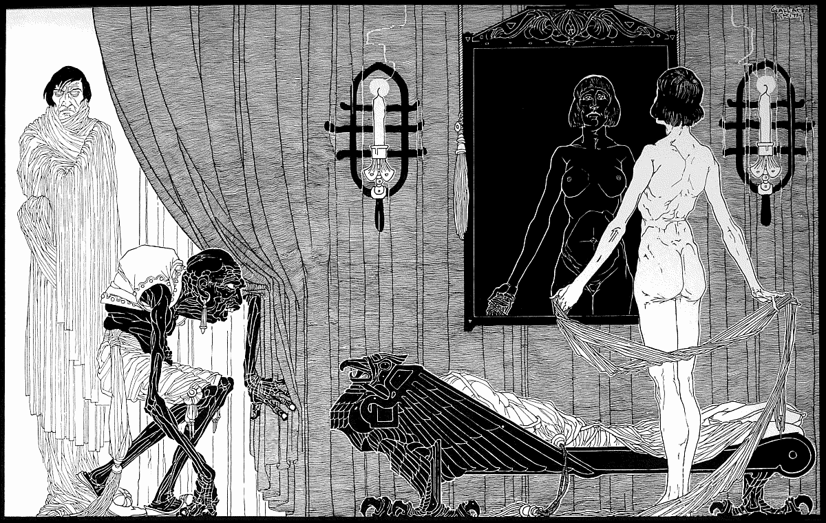 “‘Then how does it come,’ I continued thinking, ‘that he sees that which is visible only to you? His eyes are fastened on her who is to be seen only inside the caverns of Mallare. He raises his arms. His hands touch her. I am imagining Goliath. Goliath is not in the room. This is a memory of him that has wandered onto the scene of my madness.’