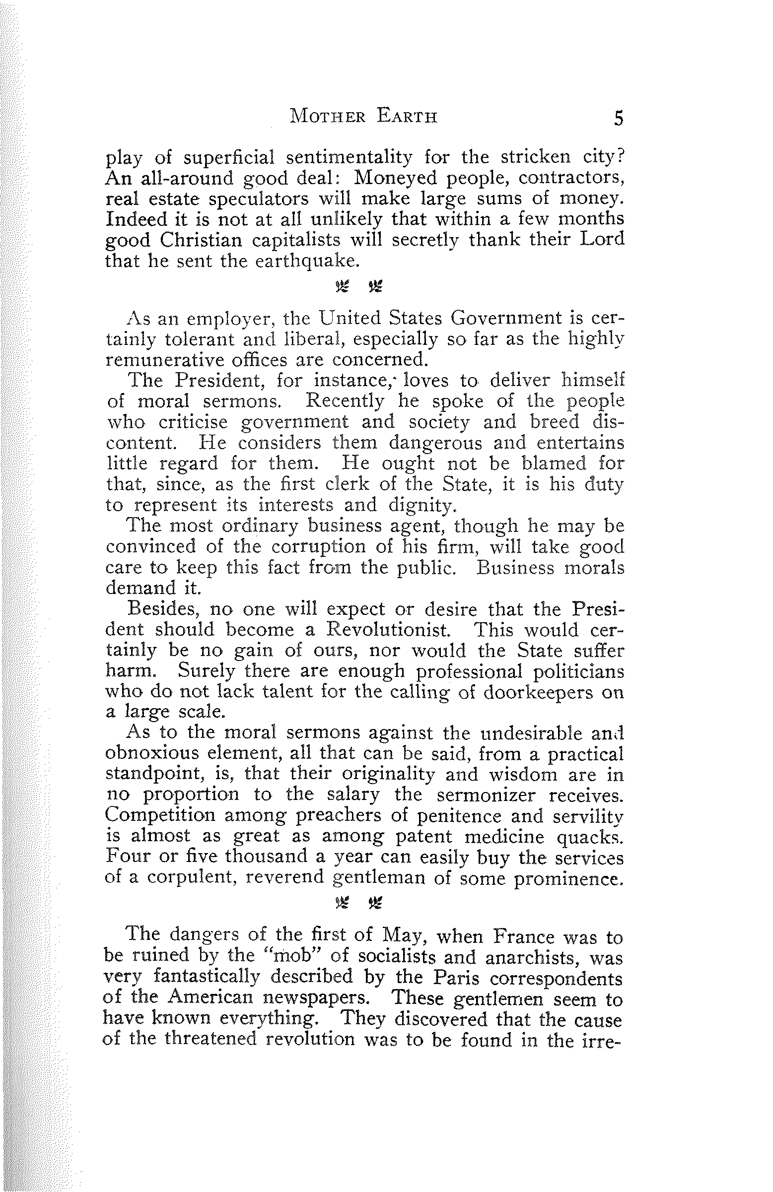 Finally what is going to be the end of the great [5]display of superficial sentimentality for the stricken city? An all-around good deal: Moneyed people, contractors, real estate speculators will make large sums of money. Indeed it is not at all unlikely that within a few months good Christian capitalists will secretly thank their Lord that he sent the earthquake.