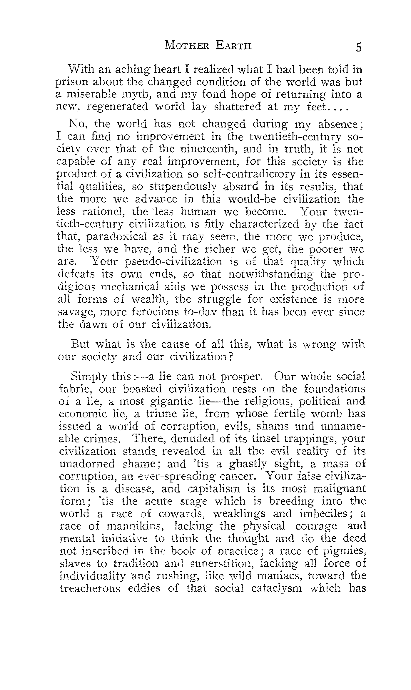 Simply this:—a lie can not prosper. Our whole social fabric, our boasted civilization rests on the foundations of a lie, a most gigantic lie—the religious, political and economic lie, a triune lie, from whose fertile womb has issued a world of corruption, evils, shams and unnameable crimes. There, denuded of its tinsel trappings, your civilization stands revealed in all the evil reality of its unadorned shame; and 'tis a ghastly sight, a mass of corruption, an ever-spreading cancer. Your false civilization is a disease, and capitalism is its most malignant form; 'tis the acute stage which is breeding into the world a race of cowards, weaklings and imbeciles; a race of mannikins, lacking the physical courage and mental initiative to think the thought and do the deed not inscribed in the book of practice; a race of pigmies, slaves to tradition and superstition, lacking all force of individuality and rushing, like wild maniacs, toward the treacherous eddies of that social cataclysm which has[6] swallowed the far mightier and greater nations of the ancient world.