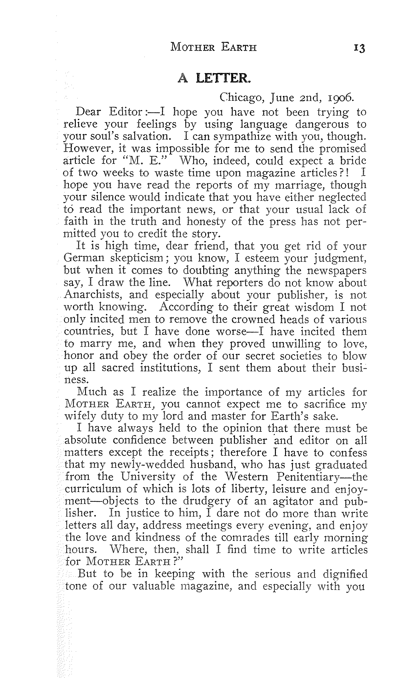 It is high time, dear friend, that you get rid of your German skepticism; you know, I esteem your judgment, but when it comes to doubting anything the newspapers say, I draw the line. What reporters do not know about Anarchists, and especially about your publisher, is not worth knowing. According to their great wisdom I not only incited men to remove the crowned heads of various countries, but I have done worse—I have incited them to marry me, and when they proved unwilling to love, honor and obey the order of our secret societies to blow up all sacred institutions, I sent them about their business.