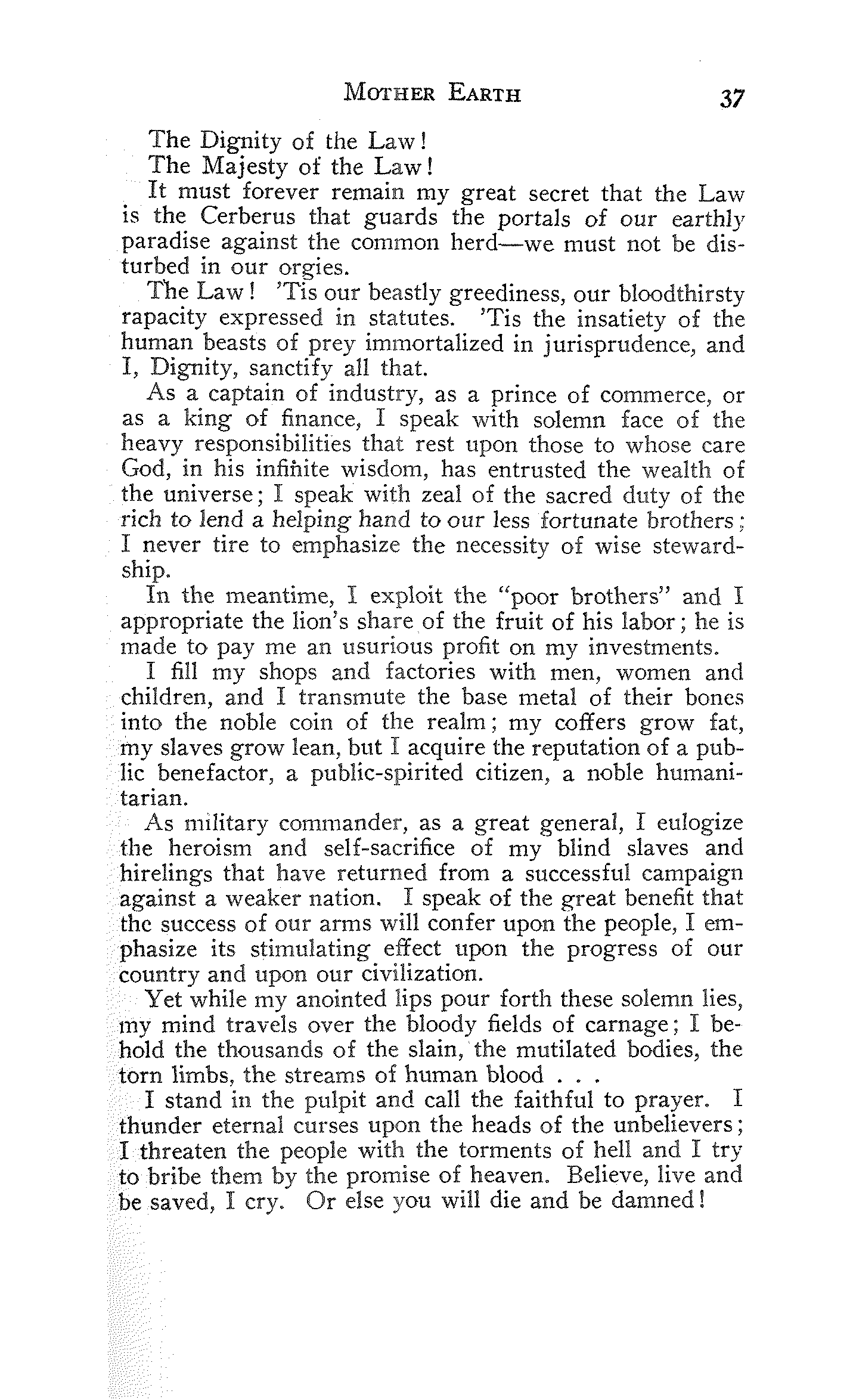 These and a thousand and one other inventions and discoveries have considerably changed the face of the world. But alas! its face only. For as I looked further, past the outer trappings, down into the heart of the world, I beheld the old, familiar, yet no less revolting sight of Mammon, enthroned upon a dais of bleeding hearts, and I saw the ruthless wheels of the social Juggernaut slowly crushing the beautiful form of liberty lying prostrate on the ground. * * * I saw men, women and children, without number, sacrificed on the altar of the capitalistic Moloch, and I beheld a race of pitiful creatures, stricken with the modern St. Vitus's dance at the shrine of the Golden Calf.