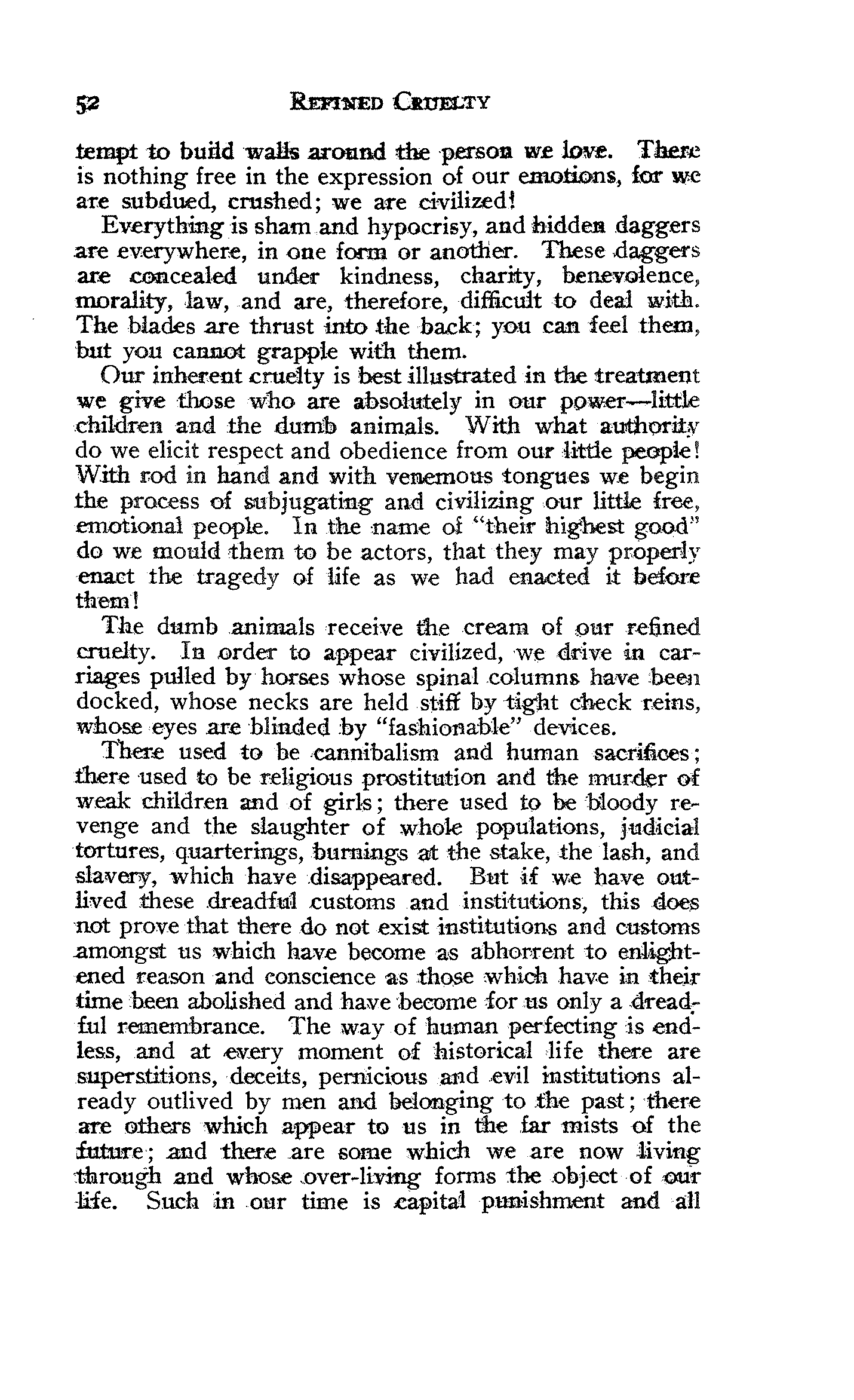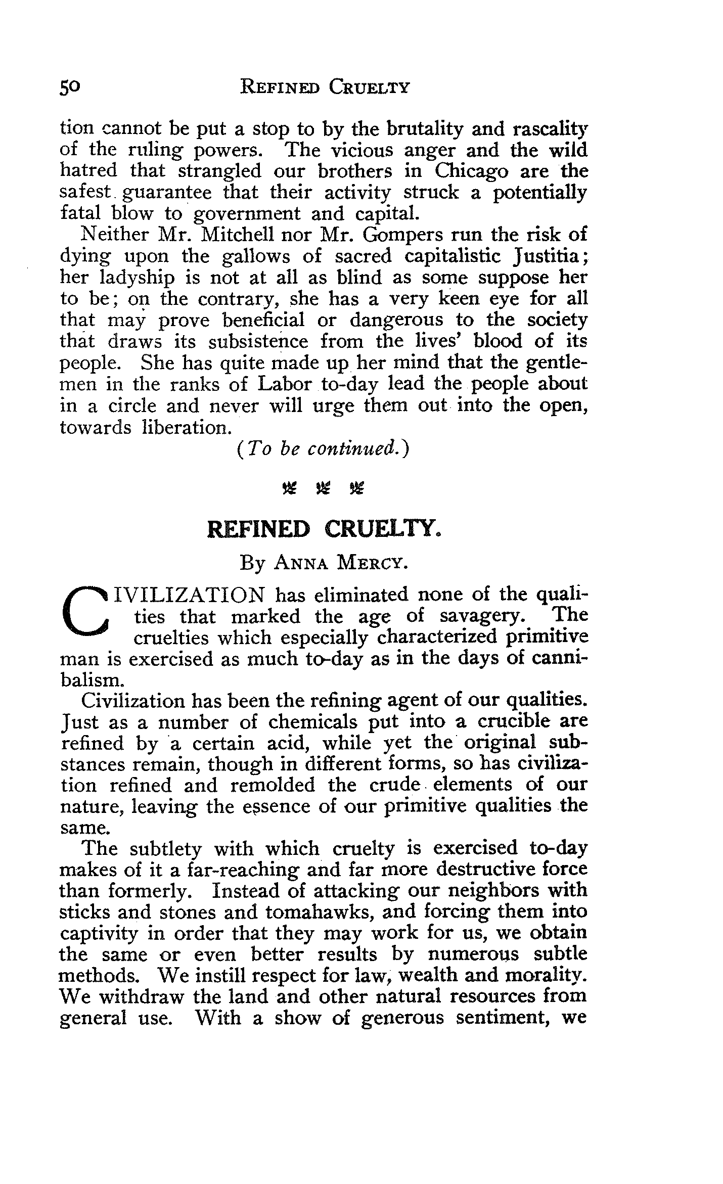 Mrs. Vanderbilt has the heels of her shoes set in diamonds, while another great philanthropist has established a pension for aged parrots. Indeed, the stupidity and sad lack of imagination of our philanthropists are pitiful. However, when one realizes that they are responsible for the distress, the poverty, and despair of the great masses of humanity, pity turns into anger and disgust with a society that will endure it all.