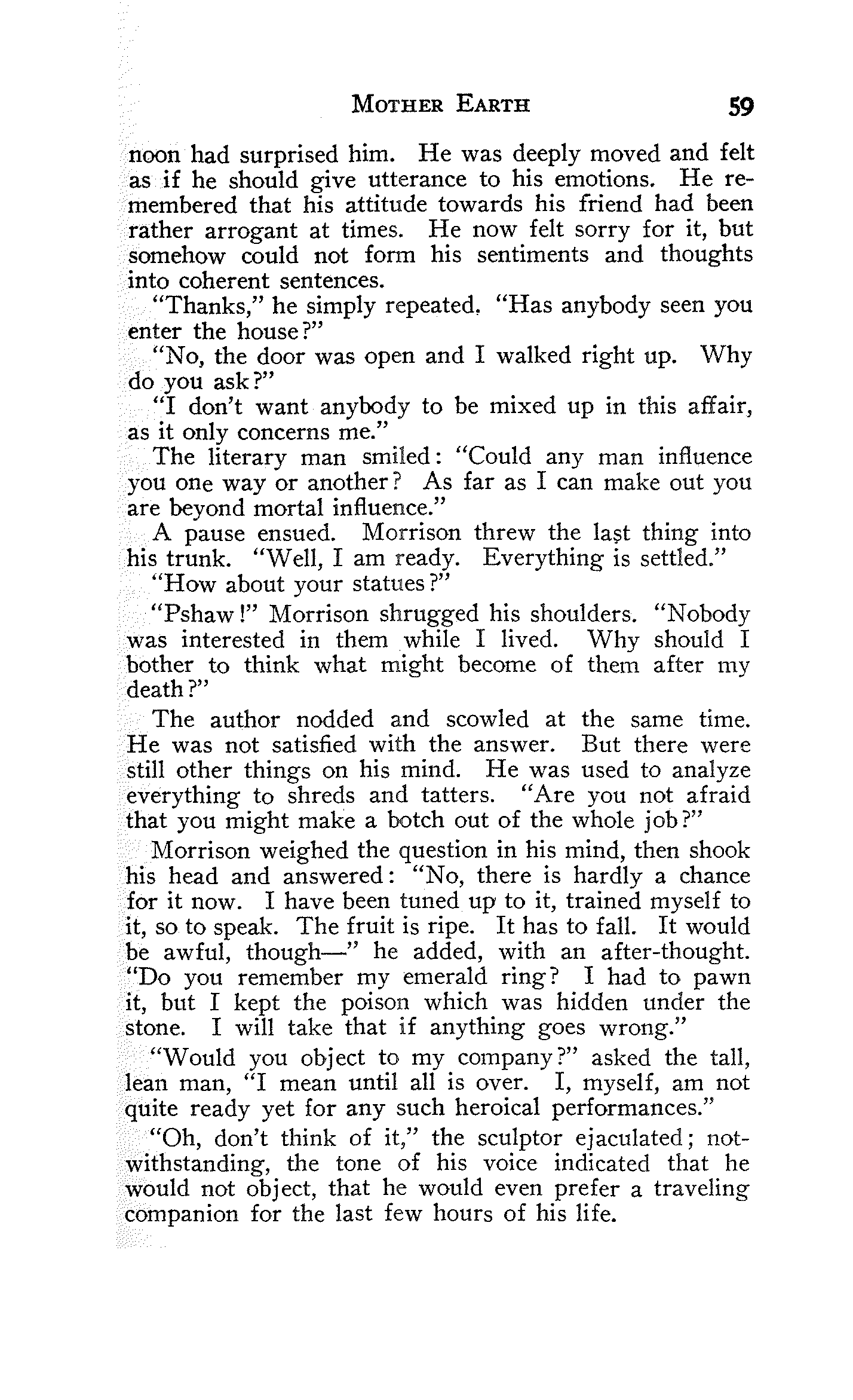 "Thanks," Morrison answered, though he did not take the money right away. He looked about absentmindedly, as in a dream. This was friendship indeed. He had not believed that anybody could so completely enter another man's state of mind. Not a word of opposition. This was glorious! They had known each other for more than seventeen years. They had often drifted apart and, somehow, had always met again. They had never been very intimate, they had merely respected each other for the work they had accomplished, each in his profession; although they differed largely in ideas. Morrison was a sculptor, and almost an ancient Greek in his feelings for the beauty of lines. The tall, lean man, on the other hand, was a strange mixture of a visionary and brutal realist. They both were cynics, however, that found life rather futile. With the literary man this was merely a theoretical view point, while Morrison was really embittered with life. The incidents of this [59]afternoon had surprised him. He was deeply moved and felt as if he should give utterance to his emotions. He remembered that his attitude towards his friend had been rather arrogant at times. He now felt sorry for it, but somehow could not form his sentiments and thoughts into coherent sentences.