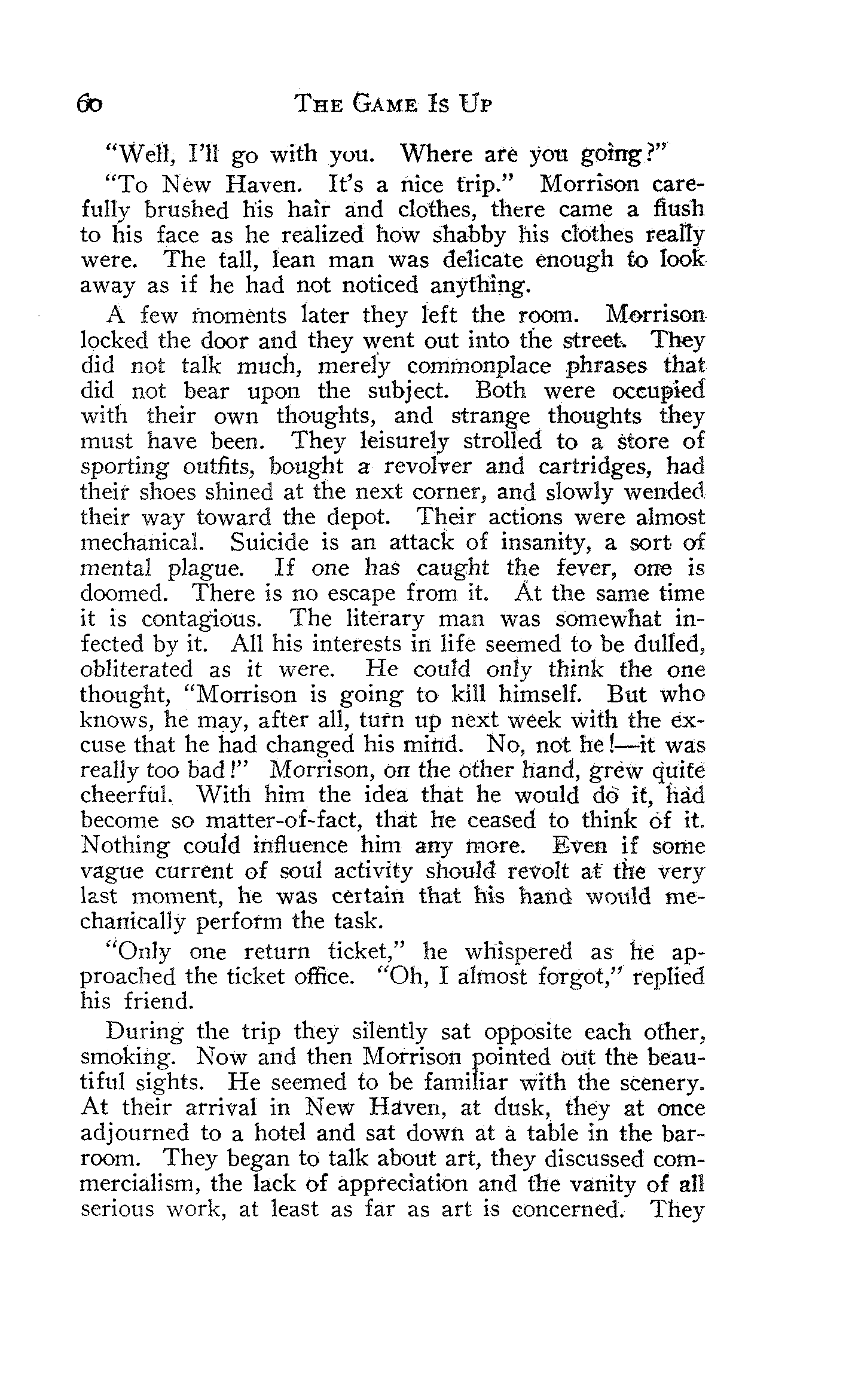 A few moments later they left the room. Morrison locked the door and they went out into the street. They did not talk much, merely commonplace phrases that did not bear upon the subject. Both were occupied with their own thoughts, and strange thoughts they must have been. They leisurely strolled to a store of sporting outfits, bought a revolver and cartridges, had their shoes shined at the next corner, and slowly wended their way toward the depot. Their actions were almost mechanical. Suicide is an attack of insanity, a sort of mental plague. If one has caught the fever, one is doomed. There is no escape from it. At the same time it is contagious. The literary man was somewhat infected by it. All his interests in life seemed to be dulled, obliterated as it were. He could only think the one thought, "Morrison is going to kill himself. But who knows, he may, after all, turn up next week with the excuse that he had changed his mind. No, not he!—it was really too bad!" Morrison, on the other hand, grew quite cheerful. With him the idea that he would do it, had become so matter-of-fact, that he ceased to think of it. Nothing could influence him any more. Even if some vague current of soul activity should revolt at the very last moment, he was certain that his hand would mechanically perform the task.