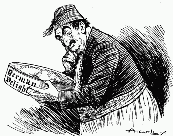 Sunday.—To-day has witnessed another triumph for the high-souled German army. Ten Belgian villages have been burnt. Some of the inhabitants have been also burnt; the rest have been driven out to starve. This will teach Belgium not to build villages in the way of a possible German advance. General von Schweinehund was in command of the noble German column. Have telegraphed my supreme congratulations and have conferred upon him the Iron Cross. How splendidly God is behaving in these days.
