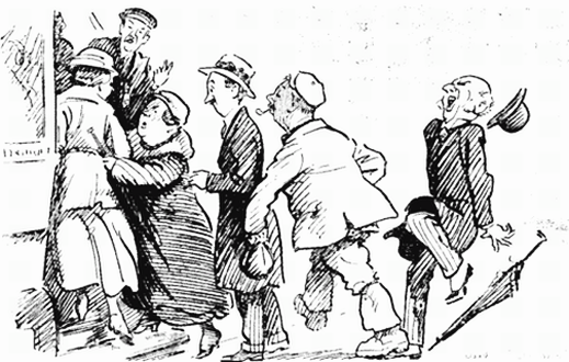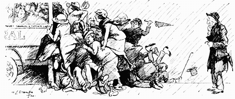 I watch the faces of the 'men,' boys in so many cases, jumping from their trains; from the north, the south, the east, the west they come, and they come not alone but dona ferentes—they carry tennis-racquets, golf-sticks, cycles, sidecars, kitbags, gladstone-bags, trunks, hold-alls."