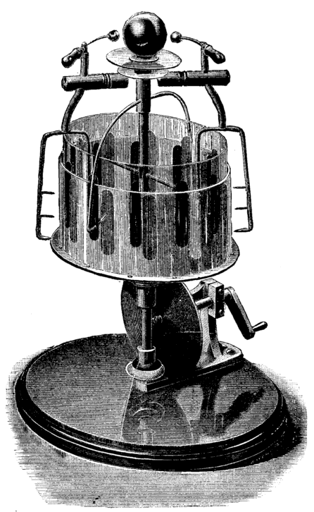 I will now endeavor to point out the more prominent features of the influence machines which I have present, and, in doing so, I must ask a moment's leave from the subject of my lecture to show you a small machine made by that eminent worker Faraday, which, apart from its value as his handiwork, so closely brings us face to face with the imperfect apparatus with which he and others of his day made their valuable researches.