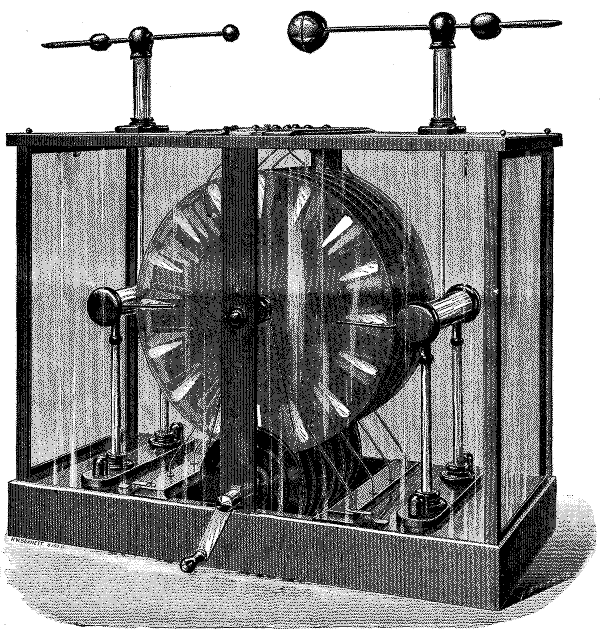 In 1762 Wilcke described a simple apparatus which produced electrical charges by influence, or induction, and following this the great Italian scientist Alexander Volta in 1775 gave the electrophorus the form which it retains to the present day. This apparatus may be viewed as containing the germ of the principle of all influence machines yet constructed.