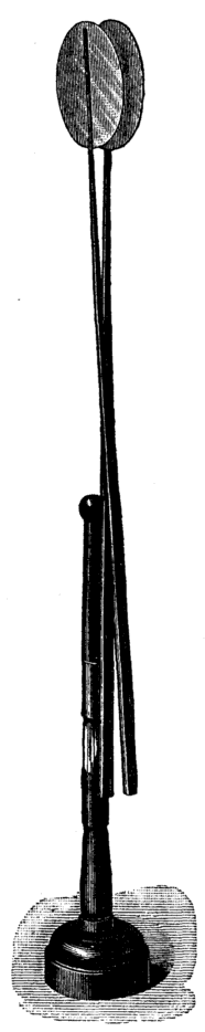 The next machine which I take is a Holtz. It has one plate revolving, the second plate being fixed. The fixed plate, as you see, is so much cut away that it is very liable to breakage. Paper inductors are fixed upon the back of it, while opposite the inductors, and in front of the revolving plate, are combs. To work the machine (1) a specially dry atmosphere is required; (2) an initial charge is necessary; (3) when at work the amount of electricity passing through the terminals is great; (4) the direction of the current is apt to reverse; (5) when the terminals are opened beyond the sparking distance, the excitement rapidly dies away; (6) it does not part with free electricity from either of the terminals singly.