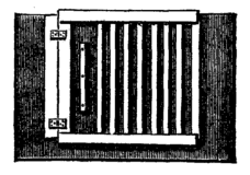 The next machine for observations is the Carre (Fig. 8). It consists essentially or a disk of glass which is free to revolve without touch or friction. At one end of a diameter it moves near to the excited plate of a frictional machine, while at the opposite end of the diameter is a strip of insulting material, opposite which, and also opposite the excited amalgam plate, are combs for conducting the induced charges, and to which the terminals are metallically connected; the machine works well in ordinary atmosphere, and certainly is in many ways to be preferred to the simple frictional machine. In my experiments with it I found that the quantity of electricity might be more than doubled by adding a segment of glass between the amalgam cushions and the revolving plate. The current in this type of machine is constant.
