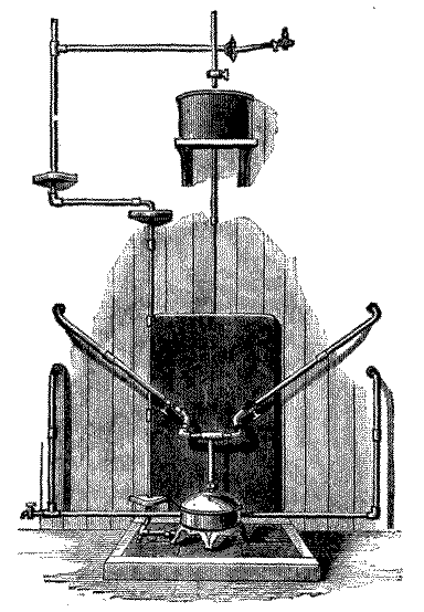 The absorption apparatus, as applied for cooling purposes, consists of a generator, which is a vessel of cast iron containing coils of iron piping to which steam at any convenient pressure is supplied; an analyzer, in which a portion of the water vapor is condensed, and from which it flows back immediately into the generator; a rectifier and condenser, in the upper portion of which a further condensation of water vapor and a little ammonia takes place, the liquid thus formed passing back by a pipe to the analyzer and thence to the generator, while in the lower portion the ammonia vapor is condensed and collected; and a refrigerator or cooler, into which the nearly anhydrous liquid obtained in the condenser is admitted by a pipe and regulating valve, and allowed to evaporate, the upper portion being in communication with the absorber.