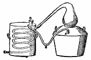 The Absorption Process.—The principle employed in this process is physical rather than mechanical. Ordinary ammonia liquor of commerce of 0.880 specific gravity, which contains about 38 per cent. by weight of pure ammonia and 62 per cent. of water, is introduced into a vessel named the generator. This vessel is heated by means of steam circulating through coils of iron piping, and a mixed vapor of ammonia and water is driven off. This mixed vapor is then passed into a second vessel, in order to be subjected to the cooling action of water. And here, owing to the difference between the boiling points of water and ammonia, fractional condensation takes place, the bulk of the water, which condenses first, being caught and run back to the generator, while the ammonia in a nearly anhydrous state is condensed and collected in the lower part of the vessel.