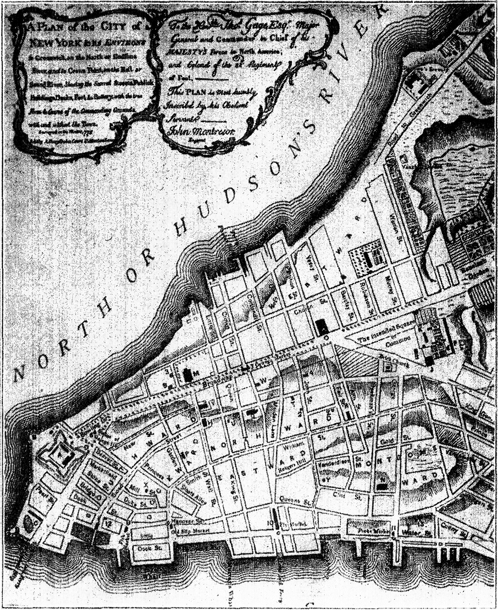 This survey, made in the winter of 1775, shows the city proper as it existed during the Revolutionary War. Places indicated by the lettering are described under the original as follows: A, Fort George. B, Batteries [at the two points of the island]. C, Military Hospital [south of Pearl St.]. D, Secretary's Office [near Fort George]. E, [Not Shown]. F, Soldiers' Barracks [at extreme right]. G, Ship Yards [lower right hand corner]. H, City Hall [Broad and Wall streets, site of present Sub-Treasury building]. I, Exchange. J, K, Jail and Workhouse [both situated on the "intended square or common," now City Hall Square]. L, College [Church and Murray streets; this was King's College, now Columbia University]. M, Trinity Church [the present Trinity was built on 1839-46, though it stands on the site of the old church built in 1696]. N, St. George's Chapel. O, St. Paul's Chapel [built in 1756, the oldest edifice still standing in N.Y.C.]. P to Z, various churches.