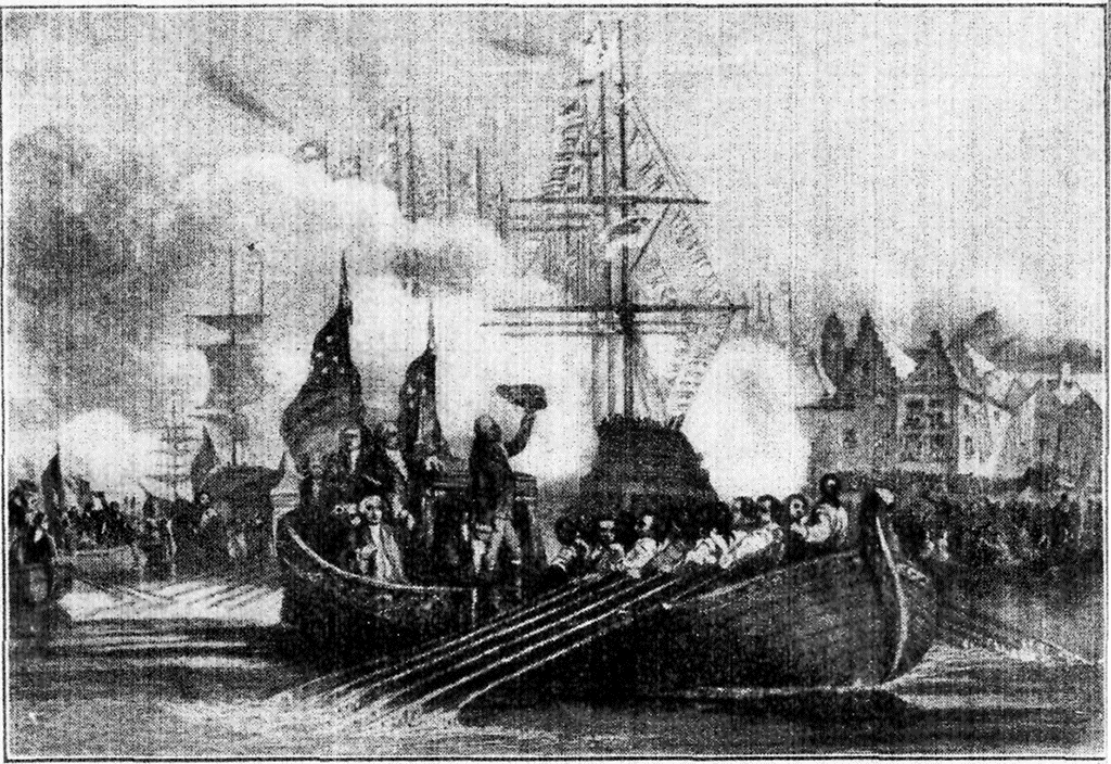 There is, for example, Rambout van Dam, the roystering youth from Spuyten Duyvil, who was doomed to journey on the river till Judgment Day—all because he started to row home after midnight from a Saturday night quilting frolic at Kakiat. "Often in the still twilight the low sound of his oars is heard, though neither he nor his boat is ever seen." Another phantom that haunts the Tappan Zee is the "Storm Ship," a marvellous boat that fled past the astonished burghers at New Amsterdam without stopping—a flagrant violation of the customs regulation, which caused those worthy officials to fire several ineffectual shots at her.