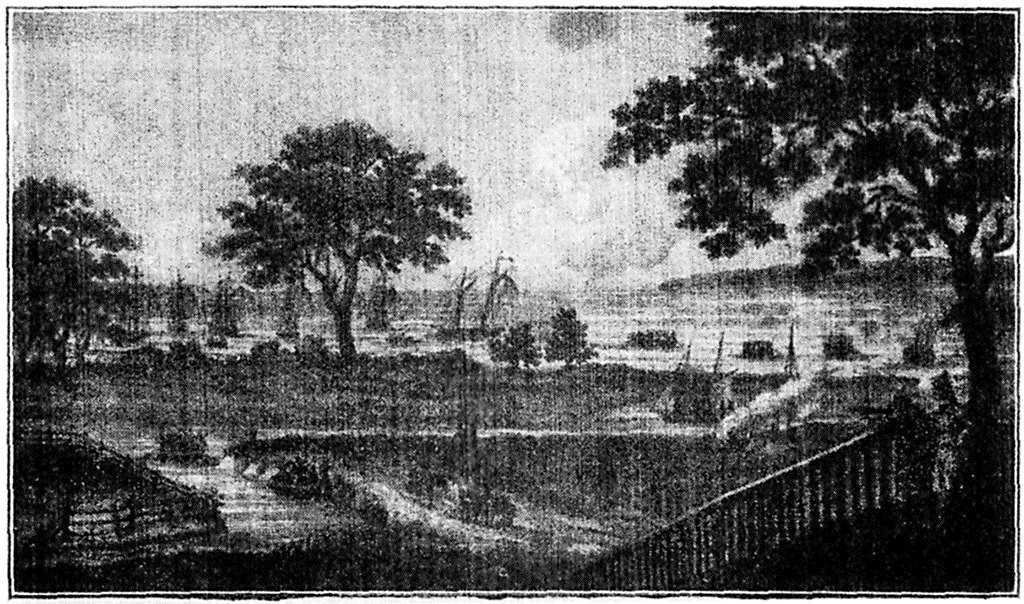 The point of land in the foreground is now known as the Battery. The large building inside the stockade is a church. In the middle foreground is a gallows. The hills in the background form the approach to the present Morningside Heights.