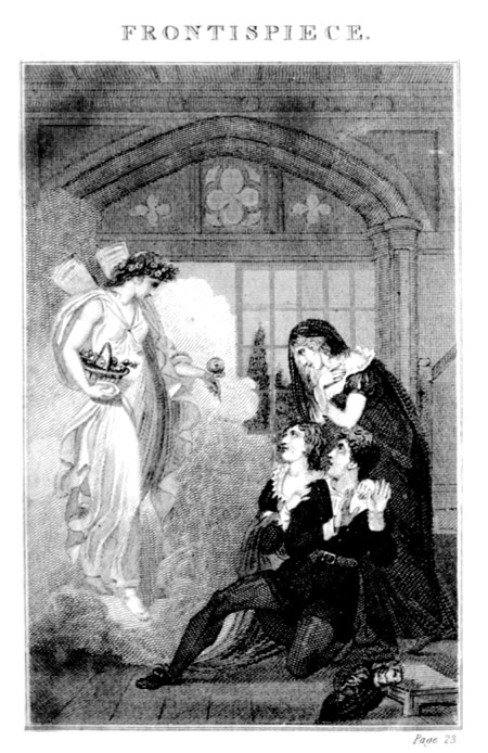 Adrian was touched; looking tenderly on his sister, “Claribel is right,” said he. “We are, indeed, bereaved of every thing else, and shall we forsake each other? Ah, Amaranthé!” he continued, his eyes swimming in tears, “time was when all our joys and all our wishes centred in each other. How fondly you once loved me—and is it at an end? Will you love me no more?” The native good feelings of Amaranthé’s heart, that had so long [70]lain dormant, were now revived. Bursting into an agony of crying, she threw her arms round her brother’s neck, and sobbed out, “Yes, yes, dear Adrian; I love you better than ever. Oh, do but be kind to me, and I will cease to deplore the loss of my beauty.” After embracing her affectionately, Adrian, looking mournfully round, observed—“This was the scene of our childish sports. How joyously we bounded like fawns over this lawn! When turning our hoops or tossing our balls, how little cared I for riches or you for beauty! And there,” pointing with his hand, “is the shrubbery where we used to play at hide and seek, and laugh at poor Claribel for not being able to find us. See the woodbine that you and she used to twine round my hat and crook, when I played at being a shepherd.”