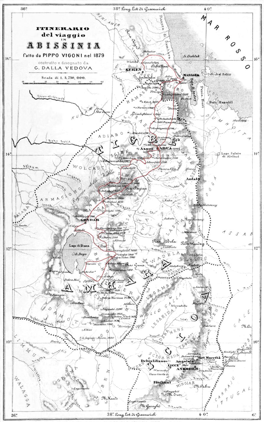 Circa la nostra spedizione, trovai un importante cambiamento nell'itinerario: invece di raggiungere Gondar passando per Kartum e Galabat, vi si andrà per Massaua e Adoa, seguendo, se si potrà, l'altra via nel ritorno.