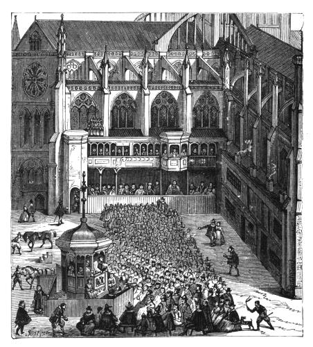 Paternoster Row: always a great centre of the book trade: it was a row immediately adjoining the precincts of the Cathedral before encroachments were made. Naturally much of the booksellers' wares was religious—paternosters, aves, credos, &c.