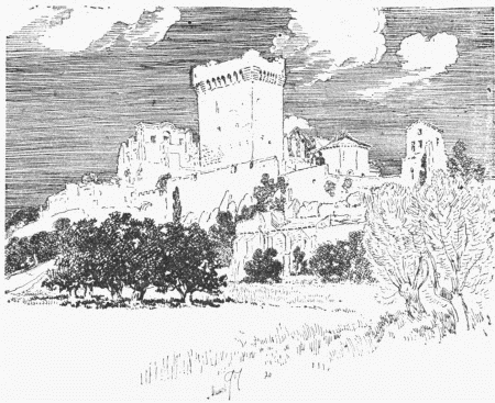 Within the old walls of its immense abbey the town of Villeneuve has built itself a rough faubourg; the fragments with which the soil was covered having been, i suppose, a quarry of material. There are no streets; the small, shabby houses, almost hovels, straggle at random over the uneven ground. The only important feature is a convent of cloistered nuns, who have a large garden (always within the walls) behind their house, and whose doleful establishment you look down into, or down at simply, from the battlements of the citadel. One or two of the nuns were passing in and out of the house; they wore grey robes with a bright red cape. I thought their situation most provincial. I came away and wandered a little over the base of the hill, outside the walls. Small white stones cropped through the grass, over which low olive-trees were scattered. The afternoon had a yellow brightness. I sat down under one of the little trees, on the grass—the delicate grey branches were not much above my head—and rested and looked at Avignon across the Rhone. It was very soft, very still and pleasant, though I am not sure it was all I once should have expected of that combination of elements: an old city wall for a background, a canopy of olives, and for a couch the soil of Provence.