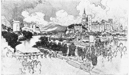 perversions, I do not pretend to carry any of them in my head. The huge bare mass, without ornament, without grace, despoiled of its battlements and defaced with sordid modern windows, covering the Rocher des Doms and looking down over the Rhone and the broken bridge of Saint-Bénazet (which stops in such a sketchable manner in mid-stream), and across at the lonely tower of Philippe le Bel and the ruined wall of Villeneuve, makes at a distance, in spite of its poverty, a great figure, the effect of which is carried out by the tower of the church beside it (crowned though the latter be, in a top-heavy fashion, with an immense modern image of the Virgin) and by the thick, dark foliage of the garden laid out on a still higher portion of the eminence. This garden recalls faintly and a trifle perversely the grounds of the Pincian at Rome. I know not whether it is the shadow of the Papal name, present in both places, combined with a vague analogy between the churches—which, approached in each case by a flight of steps, seemed to defend the precinct—but each time I have seen the Promenade des Doms it has carried my thoughts to the wider and loftier terrace from which you look away at the Tiber and Saint Peter's.