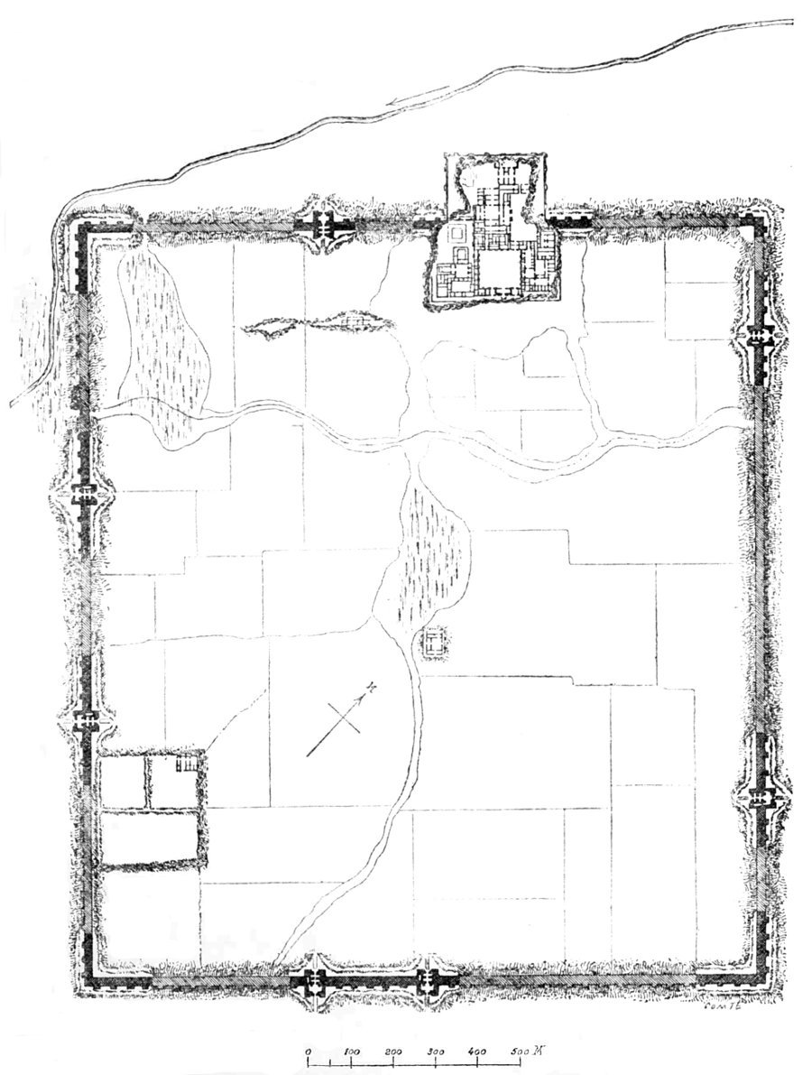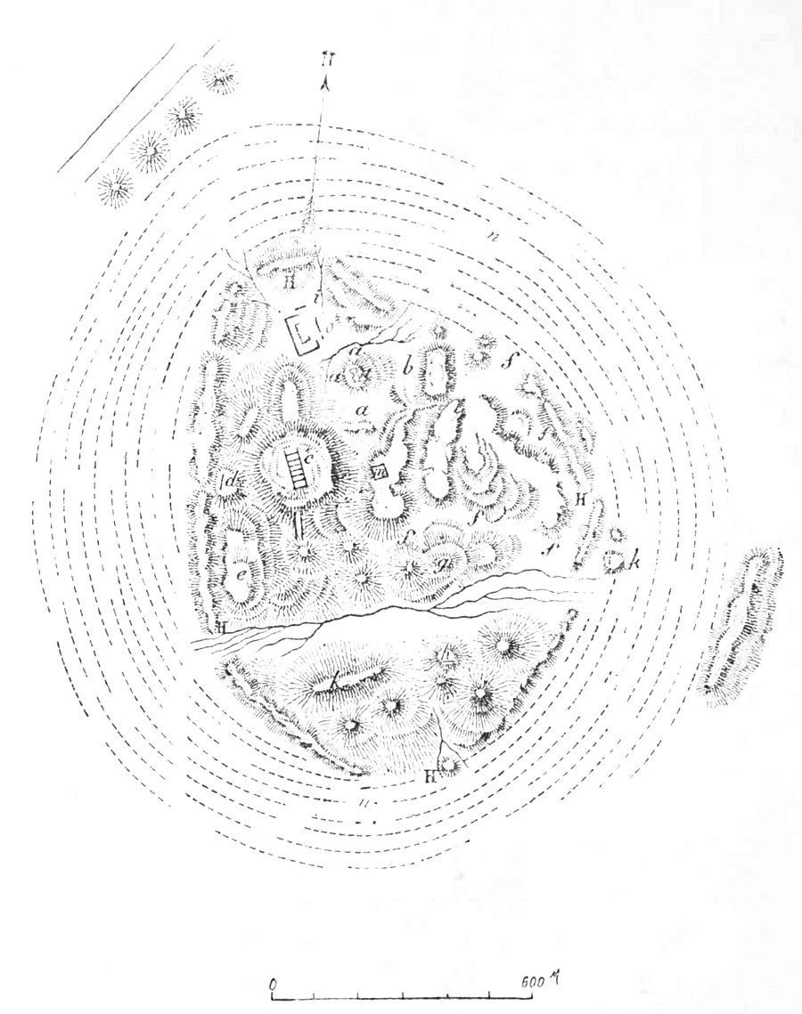 Fig. 172.—Map of Warka with its ruins; from Loftus.The surroundings of the temple in our plate—the background of slightly undulating plain, the houses similar to those found by Taylor and Loftus, in which they discovered vaulted passages traversing the thickness of the walls[456]—are, of course, purely imaginary.