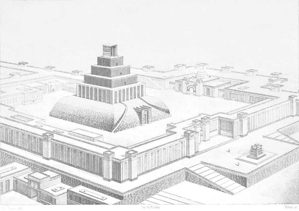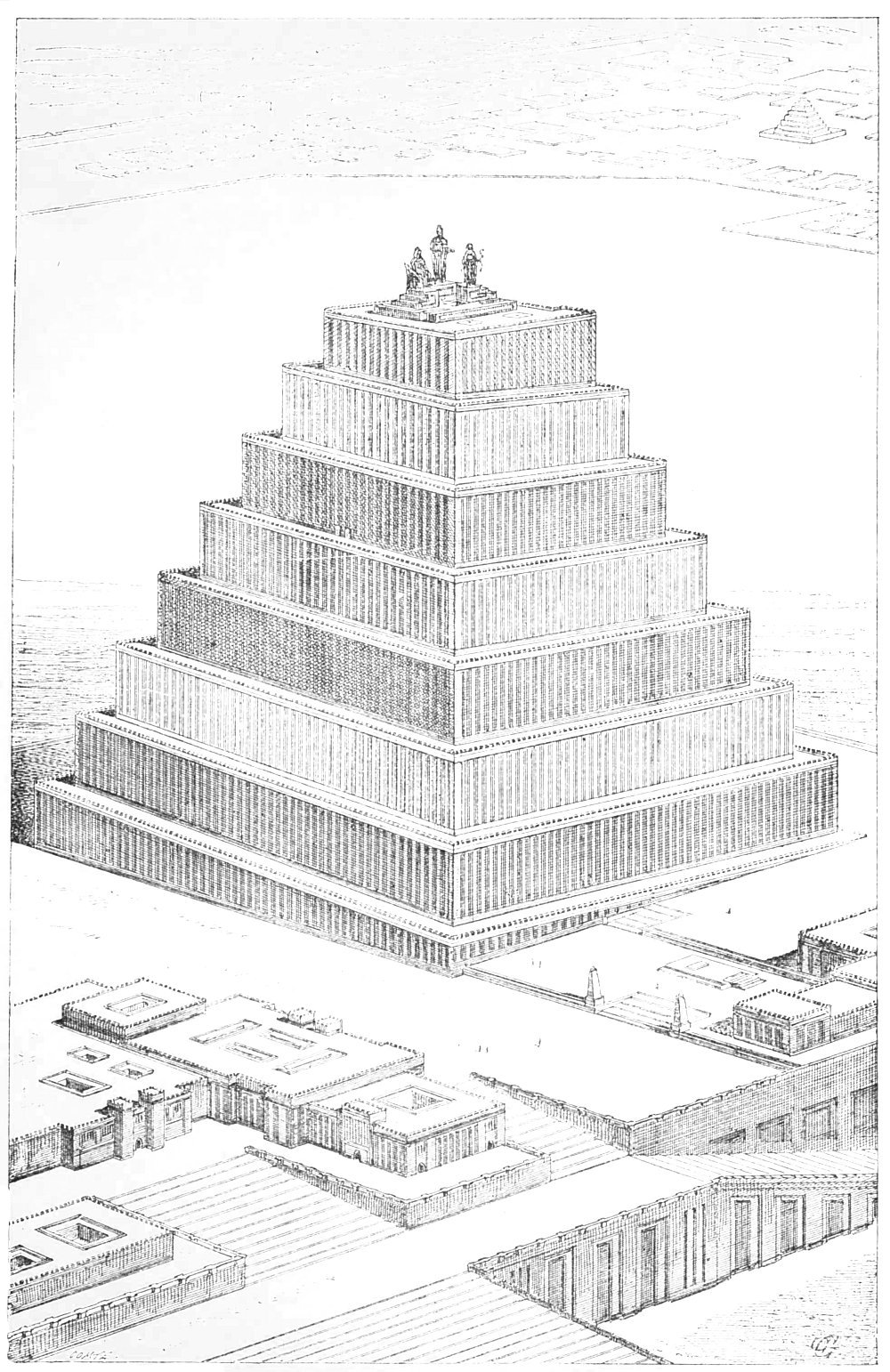 The vast esplanade about the base of the temple was suggested by the description of Herodotus. It is borne by two colossal plinths flanked and retained by buttresses. In our plate the lower of these two plinths is only hinted at in the two bottom corners. In the distance behind the temple itself may be seen one of those embattled walls which divided Babylon into so many fortresses, and, still farther away, another group of large buildings surrounded by a wall and the ordinary houses of the city.