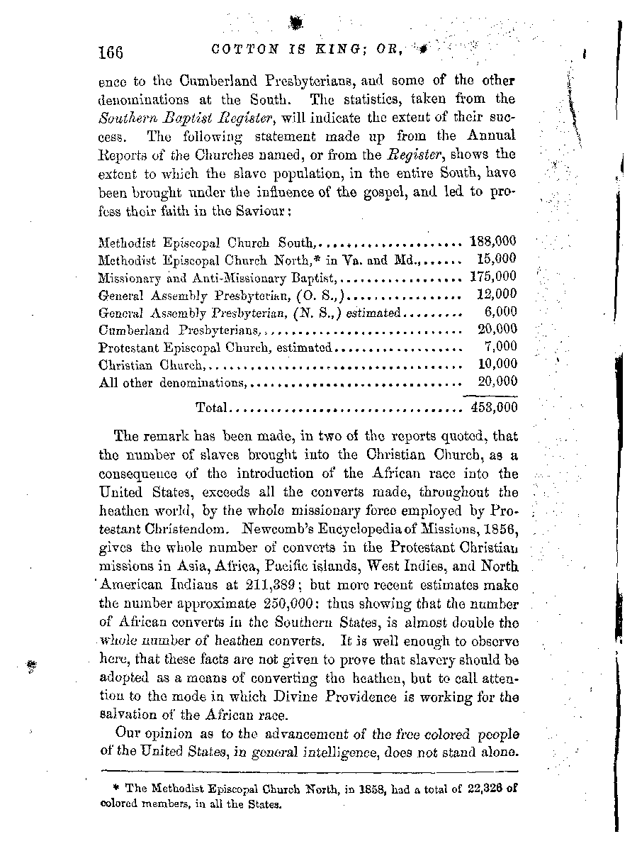 For example: One reviewer, in noticing the first edition, asserts that the writer "endeavors to prove that slavery is a great blessing in its relations to agriculture, manufactures, and commerce." The candid reader will be unable to find any thing, in the pages of the work, to justify such an assertion. The author has proved that the products of slave labor are in such universal demand, through the channels named by the reviewer, that it is impracticable, in the existing condition of the world, to overthrow the system; and that as the free negro has demonstrated his inability to engage successfully in cotton culture, therefore American slavery remains immovable, and presents a standing monument of the folly of those who imagined they could effect its overthrow by the measures they pursued. This was the author's aim.