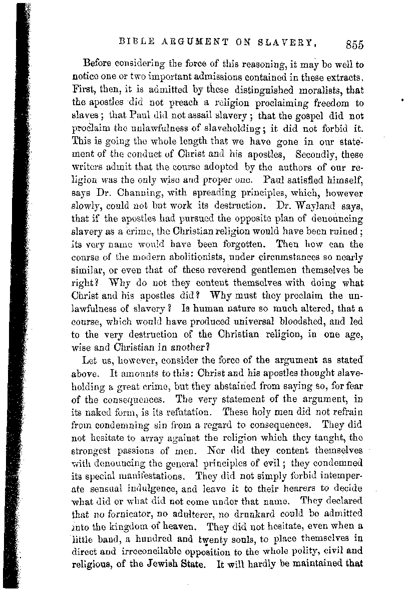 Another objects to what is said of those who hold the opinion that slavery is malum in se, and who yet continue to purchase and use its products. On this point it is only necessary to say, that the logic of the book has not been affected by the sophistry employed against it; and that if those who hold the per se doctrine, and continue to use slave labor products, dislike the charge of being participes criminis with robbers, they must classify slavery in some other mode than that in which they have placed it in their creeds. For, if they are not partakers with thieves, then slavery is not a system of robbery; but if slavery be a system of robbery, as they maintain, then, on their own principles, they are as much partakers with thieves as any others who deal in stolen property.