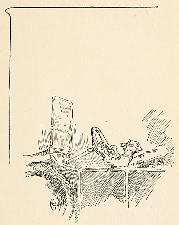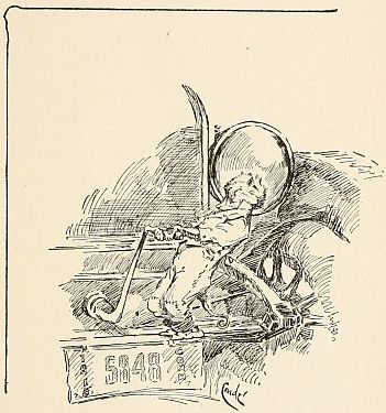 So on this particular night, when the supper-things had been cleared away, and they all had lit their pipes and Mr. Dog was sitting outside to enjoy the mild evening,[58] he told them something very astonishing. He said he supposed that they had now over at their house (meaning, of course, at Mr. Man's house) the most wonderful thing in the world. He said it was called an automobile, and was a kind of large carriage, but the strange part about it was that it went without any horse or any kind of live thing at all. When Mr. Man brought it home, Mr. Dog said, their Mr. Horse had been looking over the fence into the road, and when he saw that strange object, with Mr. Man sitting in it, holding to a wheel, go flying by, twice as fast as Mr. Horse could run, also making much more noise, and trailing smoke, Mr. Horse gave one snort and took out for the back lots, and they hadn't seen him since. Mr. Dog owned that he himself had thought it best to go under the house, and that he had spent a good deal of the first day there watching Mr. Man open a number of doors and covers that were attached to the new machine, which seemed to be full of sudden noises that Mr. Man[60] could stop whenever he wanted to, though he was not always able to start them with the handle that he turned for that purpose. Sometimes Mr. Man had to turn the handle until he was quite weak before he could get a single noise, and without the noise the carriage would not start.