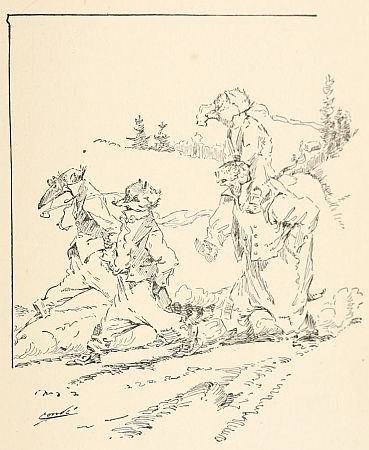 Then Mr. Turtle said he had an idea. He said down not far from his house which stood by the Wide Blue Water there was a smooth road with a good deal of a slant in it, and that if the car was over there and got started down that slant it would very likely almost run itself and move a good deal faster. So they all said yes, that was just the thing, and everybody but Mr. 'Possum took hold and pushed, because Mr. 'Possum had to steer; and by and by they got to the slanting road, which was really quite a hill, and Mr. Rabbit[92] got in again by Mr. 'Possum, and Mr. 'Coon and Mr. Crow took hold of the windlass, and sure enough, that time, the car started well enough, and went without any trouble at all. Mr. Turtle and the others had run a good ways down the road to see them pass, and pretty soon they did pass, going faster and faster every minute, and everybody cheered and waved, and Mr. 'Possum called back to Mr. 'Coon and Mr. Crow that they could turn a little slower, so all could enjoy the scenery.