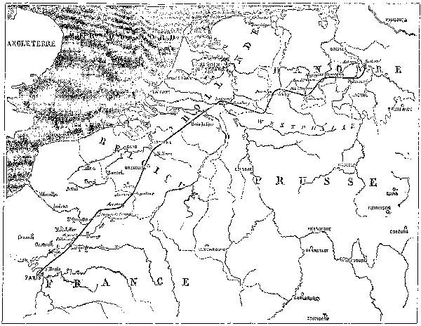Note 6: Frehren, près Rethem, où nous sommes tombés, est, si j'ai bien fait le compte, à QUARANTE-CINQ lieues (—!) de la Baltique.—Puisque nous en sommes aux chiffres, et en cas d'oubli plus tard, disons tout de suite qu'en recueillant les appréciations de mes compagnons de voyage et en établissant une moyenne,—la carte sous les yeux, bien entendu,—nous aurions conclu à un traînage de 30 à 25 minutes, par un vent de 14 à 15 lieues à l'heure. Pendant ce traînage, nous aurions subi de 60 à 80 chocs proprement dits, précipités depuis un mètre jusqu'à trente et quarante mètres de hauteur.