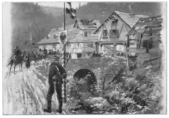 Where the Vosges mountains towered in obscurity a curtain of rain joined earth and sky. The rivers ran yellow, brimful, foaming at the fords. The semaphore on the mountain of the Pigeonnier was not visible; but across the bridge, where the Gunstett highway spanned the Sauer, gray masses of the Niederwald loomed through the rain.