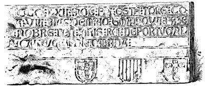 Leiria, Castello, sobre a porta da Torre de Menagem: em caracteres gothicos grosseiramente abertos sobre linhas ou pautado egualmente cavado, n'uma das pedras da muralha. Inferiormente e na mesma pedra, tres pequenos escudos, tendo o do centro as bandas ou barras de Aragão e os dos lados as quinas, convergentes.