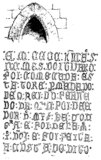 --E(ra) 1413 annos, no mez d(e) outubro, foi começada esta tor(r)e, p(or) mandado delrei Dom Fernando, da q(ua)l foi védor D(iog)o M(art)i(n)s da Tougia, e foi della m(estr)e Jo(ão) Do(mingue)s, e foi feita á custa do dito.