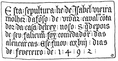 --Esta sepultura é de Isabel Vieira, mulher d(e) Af(f)o(n)so de Vivar, Caval(lei)ro, co(n)tador da casa delrei nos(s)o s(enhor), q(ue), depois de seu fal(l)ecim(en)to, foi Com(m)e(n)dador das Alencarcas. E se finou a 18 dias de fevereiro de 1492.