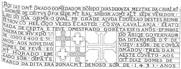 --Aq(u)i jaz o m(ui)to (h)o(n)rado Com(m)e(n)dador Do(m) Lopo Dias de Sousa, Mestre da Caval(la)ria da Orde(m) de Christo, q(ue) foi se(m)p(r)e m(ui)to leal s(e)r(v)idor ao m(ui)to alto se(m)p(r)e ve(n)cedor elrei Do(m) Joã(o) o p(r)im(ei)ro, (a)o qual foi gra(n)de ajuda e(m) defe(n)são d'estes reinos; e e(n)trou co(m) el(l)e ci(n)co vezes e(m) Castel(l)a co(m) sua Caval(l)aria, e e(m) a tomada de Ceuta; e teve o mestrado q(u)are(n)ta e seis an(n)os. E finou-se na era de Jesus Christo de 1435 an(n)os, aos nove dias do mes de fev(erei)ro, e o m(ui)to ho(n)rado e presado s(enh)or o I(n)fa(n)te Do(m) (H)e(n)riq(u)e, governador da dita orde(m), duq(ue) de Viseu e s(enh)or de Covilha(m), o ma(n)dou tra(s)ladar a este co(n)ve(n)to, aos oito dias do mez de março da dita era do na(s)c(i)m(en)to de Nos(s)o S(enh)or de 1435 an(n)os.