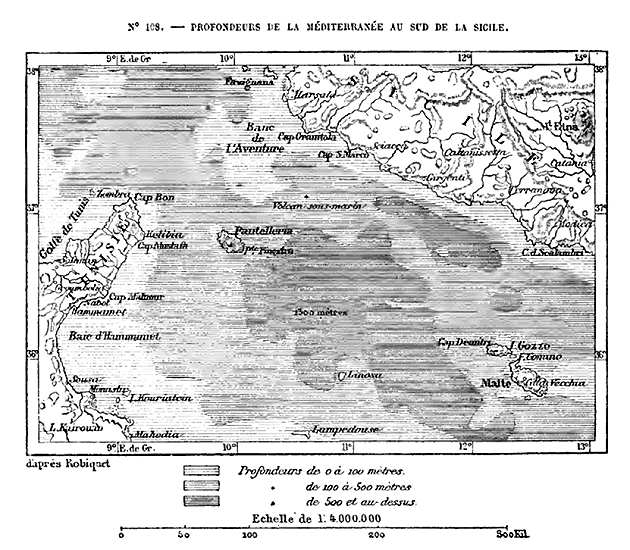 La mer Ionienne est nettement séparée de la cavité de l'Adriatique par un seuil qui s'élève dans le détroit d'Otrante, mais elle est encore bien mieux limitée à l'ouest par les bas-fonds qui rejoignent la Sicile à la Tunisie, en formant un isthme sous-marin, déjà signalé par Strabon. Géologiquement la Méditerranée se trouve interrompue, puisque une brèche, où l'épaisseur de l'eau ne dépasse pas 200 mètres, est la seule porte ouverte entre ses deux bassins. Celui de l'Ouest, le moins vaste et le moins profond des deux, présente encore des gouffres de plus de 2000 mètres dans la mer Tyrrhénienne et de 2500 mètres et même 3000 mètres dans la mer des Baléares, puis il va se terminer au seuil hispano-africain, situé, non entre Gibraltar et Ceuta, où les fonds ont jusqu'à 920 mètres, mais plus à l'ouest, dans des parages où le détroit s'évase largement vers l'Océan 3.