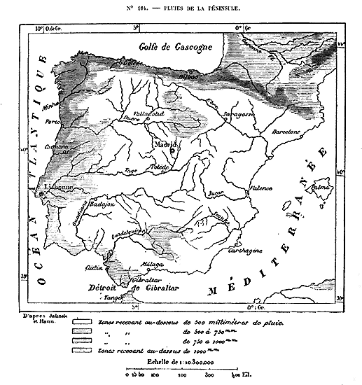 Cette Europe en résumé, qui comprend, en outre des trois péninsules méditerranéennes, la France, l'Allemagne et l'Angleterre, se divise naturellement en plusieurs parties. Les îles Britanniques forment un premier groupe nettement séparé, grâce à la ceinture de mers qui l'environne. La presqu'île hispanique n'est guère moins distincte du reste de l'Europe, car elle vient confiner à la France par un véritable rempart de montagnes, le plus difficile à franchir qui existe dans le continent; en outre, une profonde dépression, dont le seuil de partage n'a pas même 200 mètres, 14 réunit l'Océan et la Méditerranée, immédiatement au nord de l'Espagne. L'unité géographique n'est complète que pour le système des Alpes et les chaînes de montagnes qui s'y rattachent, en France, en Allemagne, en Italie et dans la péninsule hellénique: c'est là que se trouve la charpente de l'édifice continental.