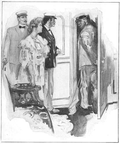 Once aboard, I waved across the intervening stretch of sea to my friends, and looked about me. There was no sign or sound of life anywhere on the yacht. She swung noisily, with creaks and groans, to the pulse of the tide, but there was no witness to human presence there. Mademoiselle immediately was in my thoughts, and I found my way to the state-rooms to reassure her, if she should be awake. They were as we had left them, save that every cabin had been ransacked and every box turned inside out. The cabins were empty, and so was the boudoir. Clearly, Mademoiselle Trebizond was not there. I went down into the saloon, but nothing rewarded me there; and afterwards I turned along the passage that led to the officers' quarters, and farther on, the steward's room. Here, too, was my own surgery, and instinctively I stopped when I reached it. The door stood ajar. No doubt, I thought, like every other place, it had suffered the ravages of the mutineers. I opened it wide, and started back, for there on the floor, a bottle in her hand, and her features still and tragic, lay Yvonne Trebizond!