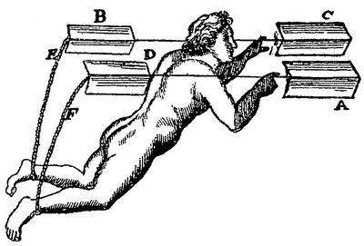 Ce mouvement en diagonale a semblé très bien imaginé, puisque c'est celuy qui est naturel aux quadrupèdes et aux hommes quand ils marchent ou quand ils nagent; et cela fait bien espérer de la réussite de la machine. On trouve néanmoins que, pour la rendre d'un plus grand usage, il y manque deux choses. La première est qu'il y faudroit adjouster quelque chose de très léger et de grand volume, qui, estant appliqué à quelque partie du corps qu'il faudroit choisir pour cela, pust contre-balancer dans l'air le poids de l'homme; et la seconde chose à désirer seroit que l'on y ajustât une queüe, car elle serviroit à soutenir et à conduire celuy qui voleroit; mais l'on trouve bien de la difficulté à donner le mouvement et la direction à cette queüe, après les différentes expériences qui ont esté faites autrefois inutilement par plusieurs personnes.