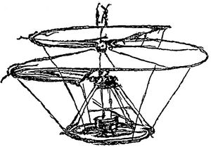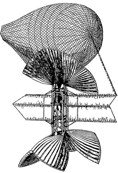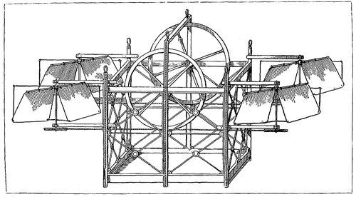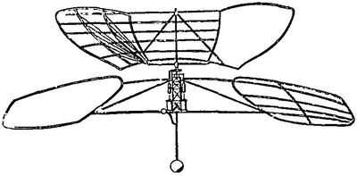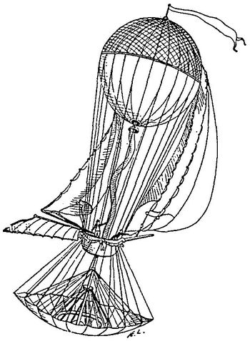 Après ses études sur le vol, Léonard de Vinci a donné une idée de l'hélicoptère, et il a eu le mérite d'imaginer le parachute, avec une rare intelligence. Un savant italien, M. Govi, a résumé ces travaux à l'Académie des Sciences dans sa séance du 29 août 1881[12], à propos du petit propulseur à hélice que j'avais installé dans la nacelle du minuscule aérostat électrique de l'Exposition d'électricité.