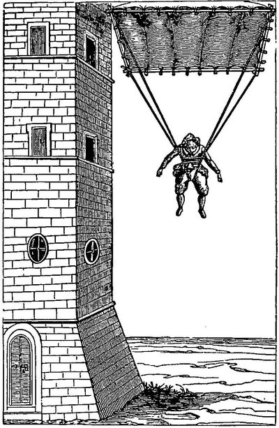 Note 14: «Se un uomo ha un padiglione di pannolino intasato, che sia 12 braccia per faccia, e alto 12, potrà gittarsi da ogni grande altezza senza danno di sè» (Codice Atlantico, fo 372, verso).[Retour au texte principal]