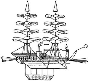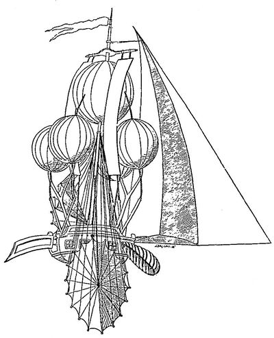 Dans sa relation des États du Soleil, Cyrano de Bergerac décrit une autre machine qu'il appelle un oiseau de bois. Swift dans ses aventures de Gulliver a décrit l'île de Laputa, qui plane au moyen de procédés électriques. Nous allons voir tout à l'heure l'électricité intervenir encore dans d'autres curieuses fantaisies aériennes.