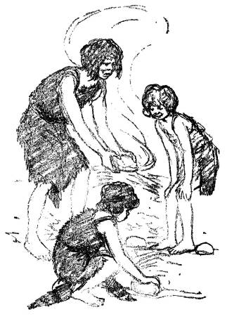 In the earliest times of all, the Woman hunted and trapped the wild creatures, and fished, all by herself, but by and by she began to let the Man do the hunting and bring home the game, while she stayed in the cave house and kept the hearth-fire bright and took care of the children. She cooked the food that he brought home, and she made needles out of bones and sewed skins together for clothes for her husband and the children and herself. After a long time she began to plant seeds of the wild things that she found were good to eat, and to raise food out of the ground.