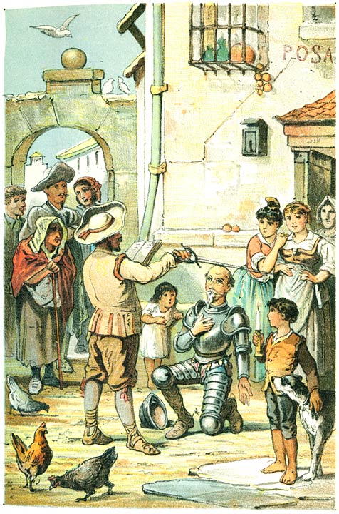 Door deze nederige toespraak, waarin een zoo hooge lof voor hem lag opgesloten, niet weinig gestreeld, toonde Don Quichot zich dan ook terstond bereid den slag te ontvangen; en om aan de zaak de behoorlijke plechtigheid bij te zetten, haastte de herbergier zich de beide ganzenmeiden en een keukenjongen te halen, om er als getuigen bij te dienen. Hierop beval hij den gekken ridder, neer te knielen, vroeg hem zijn zwaard en bracht hem daarmee twee zoo duchtige slagen op de schouders toe, dat ieder ander dan onze standvastige held het daarbij van pijn zou uitgeschreeuwd hebben. De dikke waard hield hierop eene korte toespraak, beval toen aan de meiden, welke Don Quichot nog altijd voor voorname, schoone jonkvrouwen hield, hem zwaard en sporen aan te gespen, en verklaarde, dat de ceremonie hiermee naar eisch was afgeloopen.