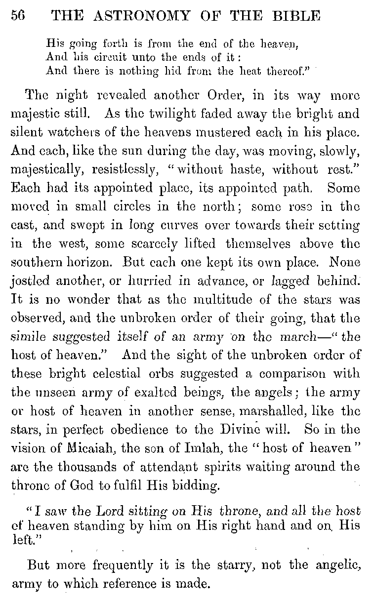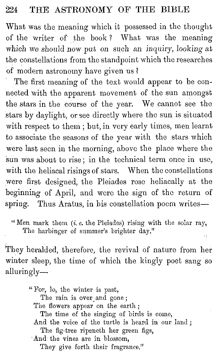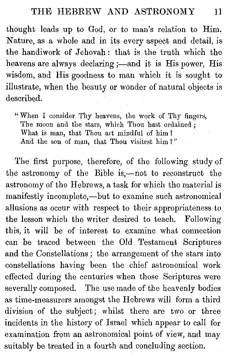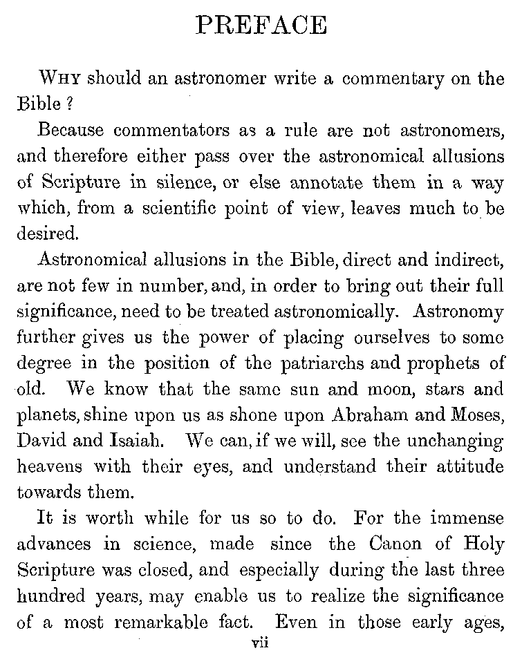 Astronomical allusions in the Bible, direct and indirect, are not few in number, and, in order to bring out their full significance, need to be treated astronomically. Astronomy further gives us the power of placing ourselves to some degree in the position of the patriarchs and prophets of old. We know that the same sun and moon, stars and planets, shine upon us as shone upon Abraham and Moses, David and Isaiah. We can, if we will, see the unchanging heavens with their eyes, and understand their attitude towards them.