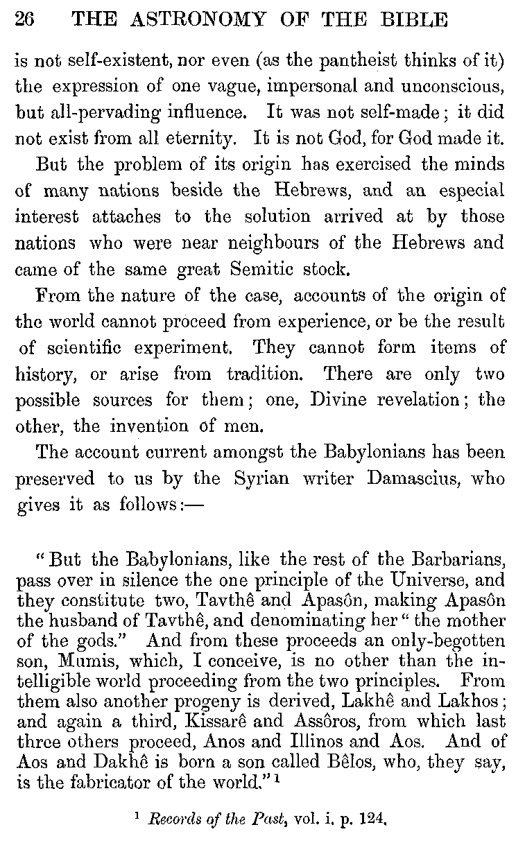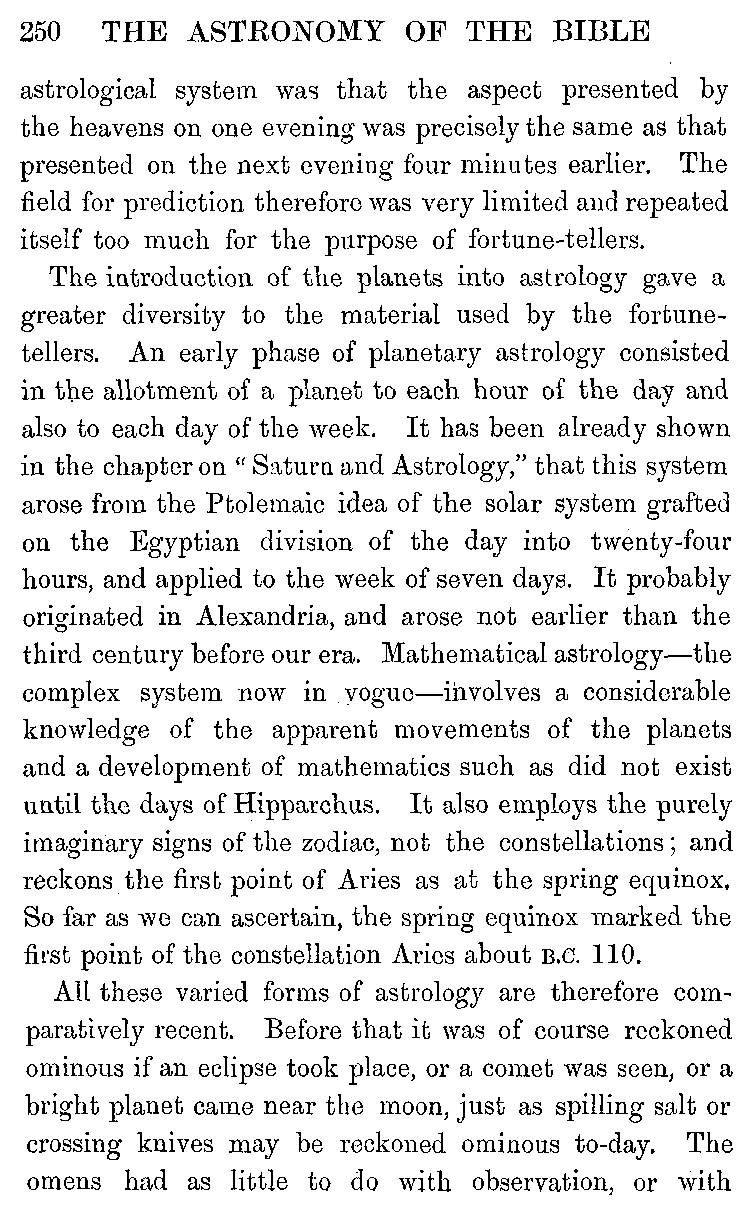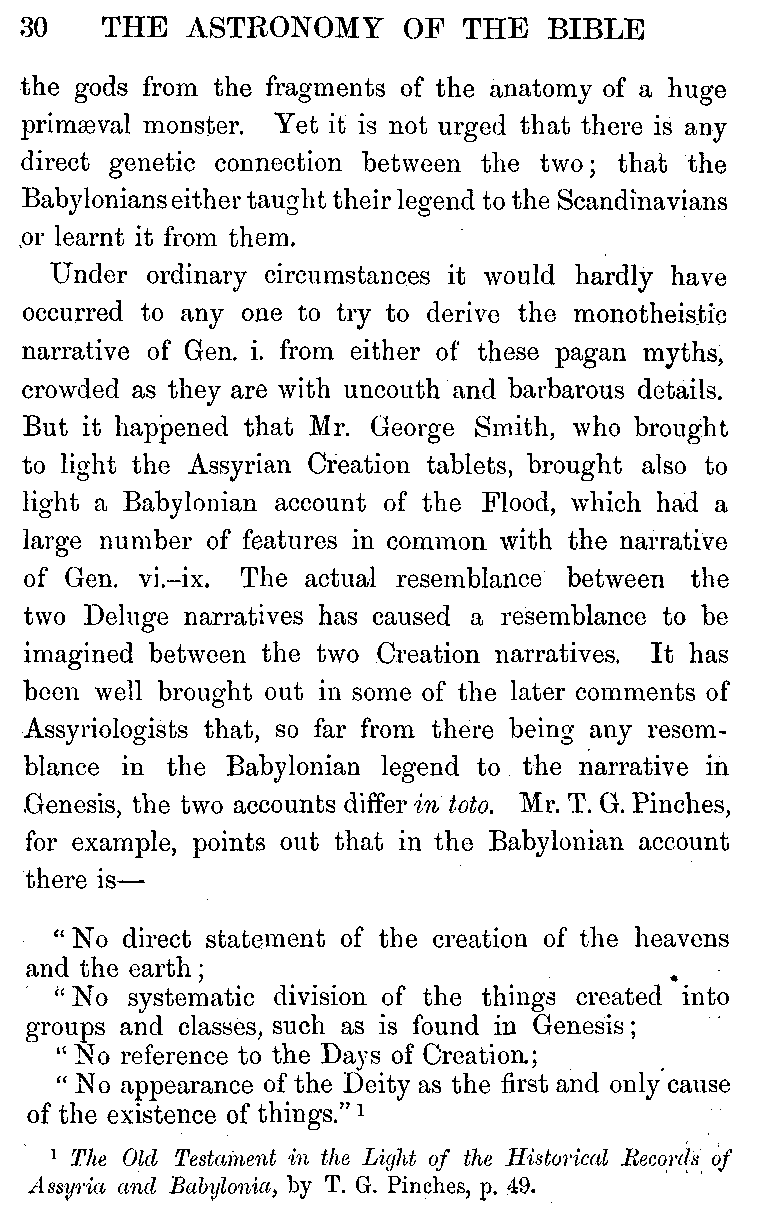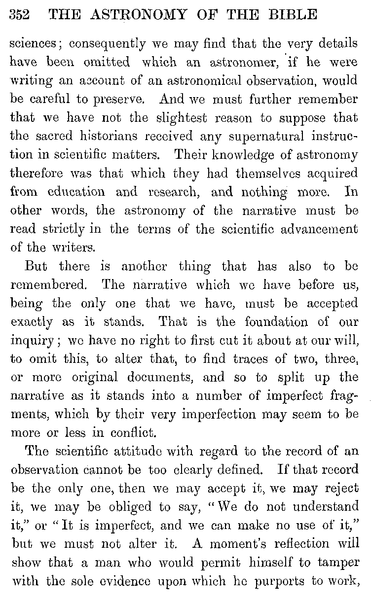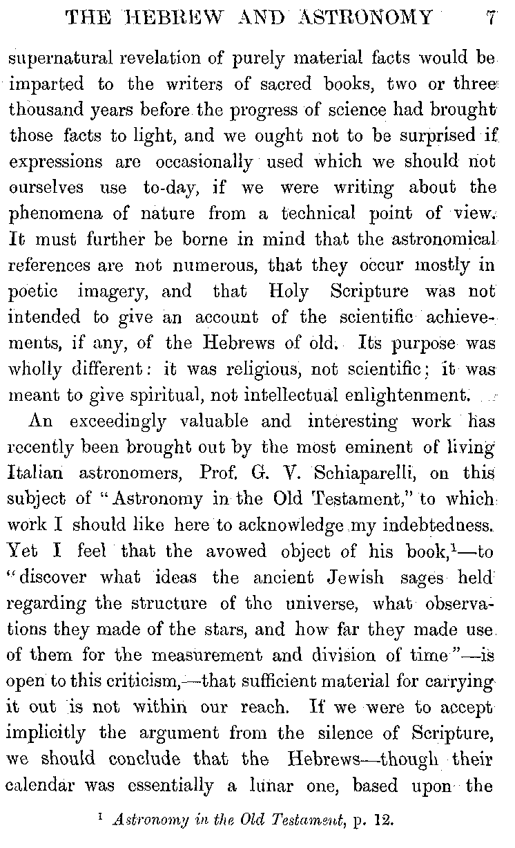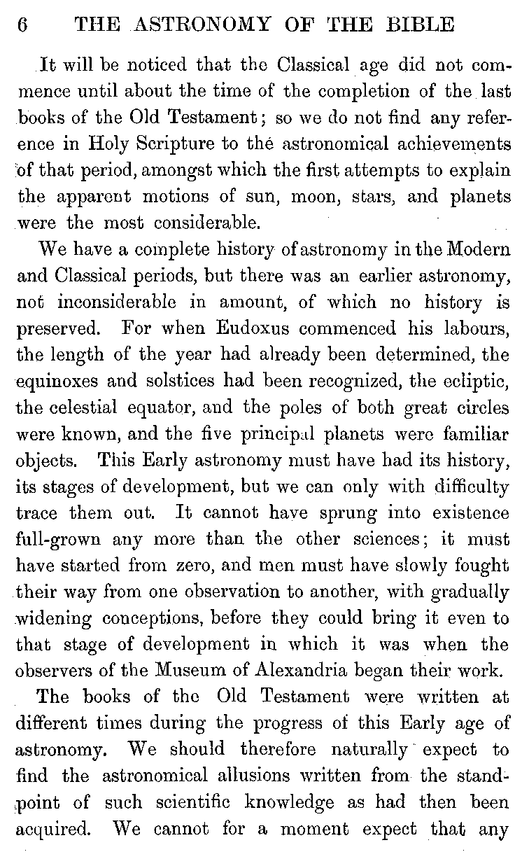 Astronomy has a yet further part to play in Biblical study. The dating of the several books of the Bible, and the relation of certain heathen mythologies to the Scripture narratives of the world's earliest ages, have received much attention of late years. Literary analysis has thrown much light on these subjects, but hitherto any evidence that astronomy could give has been almost wholly neglected; although, from the nature of the case, such evidence, so far as it is available, must be most decisive and exact.